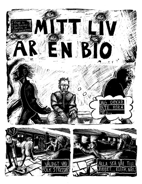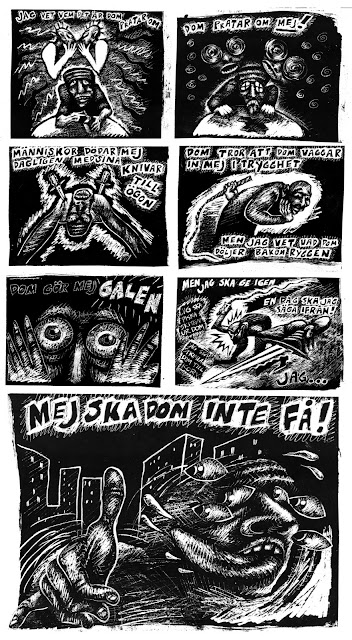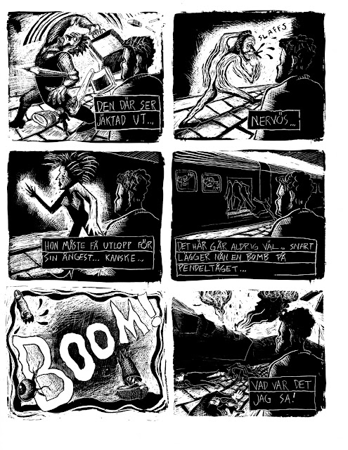 Åstrands bilder är som kollage av influenser, både konstnärliga och musikaliska. Här finns tuschsvarta bilder som får mig att minnas tidningen Puss medan andra kunde vara rutor från någon tecknad serie de senaste tio åren. Inte blir jag förvånad när det mot slutet av boken också kommer ett par sidor med tecknare serier.