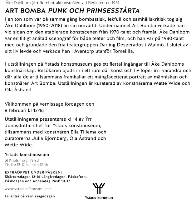 Min sambo Mette Wide och jag kuraterar en utställning med Åke Dahlbom, alias Art Bomba, i Ystad nästa månad. Clemens Altgård och jag tog med Åke i utställningen Malmö Brinner på Moderna Museet i Malmö 2017. Samtidigt denna gång ställer Ella Tillema ut. Kommer bli PUNK OCH POLITIK precis som vår tid behöver!