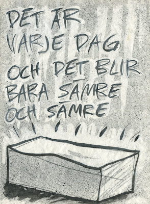 Jag tror Sue Coe har rätt när hon påstår att det finns en ekonomisk censur vad gäller konst som inte håller sig till reglerna, och att konstnärer anpassar sig till dem. Medvetet eller omedvetet, vi är en utsatt yrkesgrupp. Konsten har alltid varit kommersiell men jag kan ibland undra var det kulturella alternativet till konstvärlden finns idag? Jag är såklart för gammal för att veta det. Det pågår säkert en helt underbar och uppkäftig underjordisk kultur just nu som jag aldrig kommer få veta något om om. Där unga människor ber etablissemanget dra åt helvete.